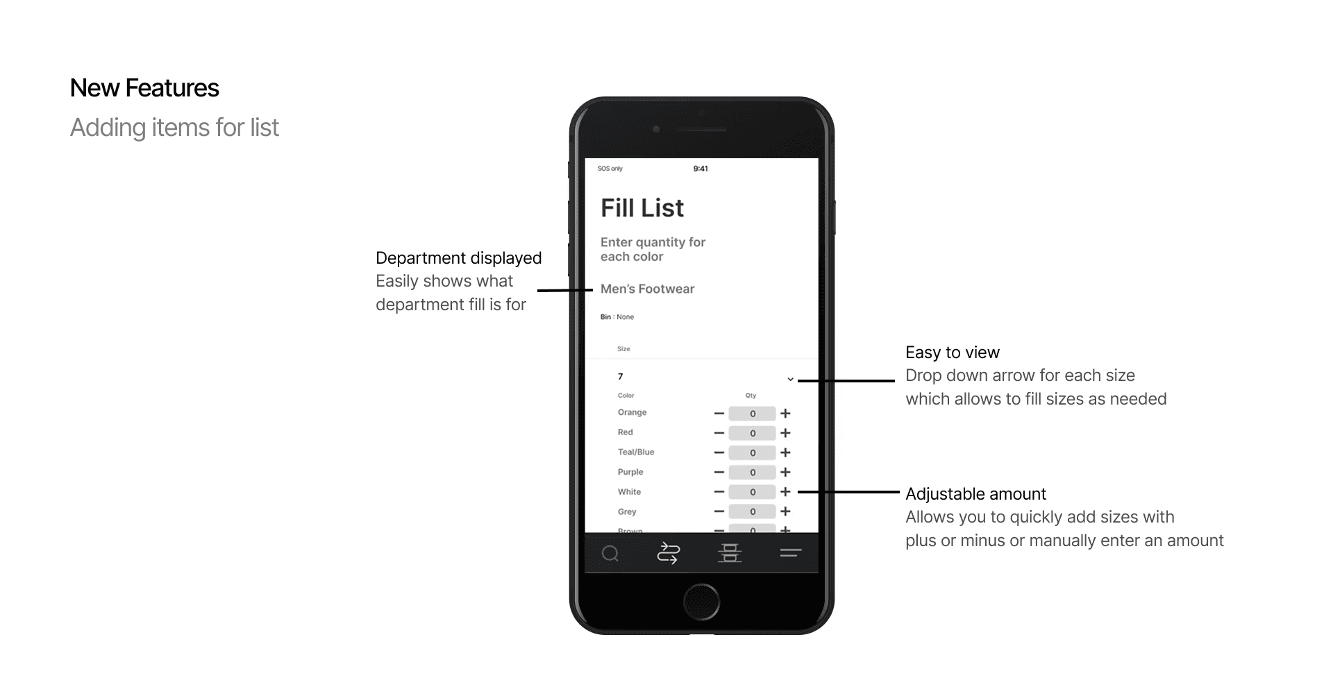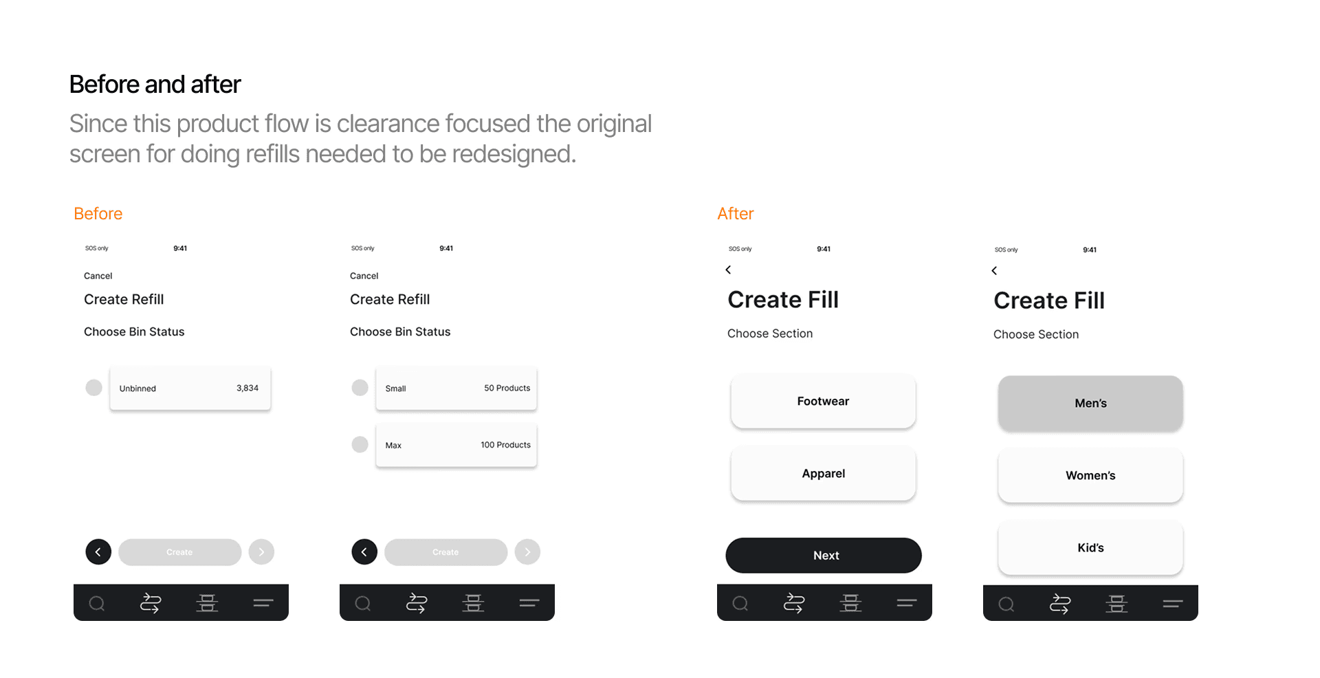 This is the clearest way to see what changed. The original screen asks users to pick a bin status and product count which works fine in a factory context but means nothing in a clearance store. The redesign starts with department and section, mirrors how the team already thinks, and cuts out every unnecessary step. Same task. Totally different experience.