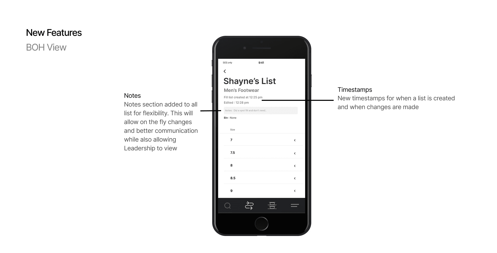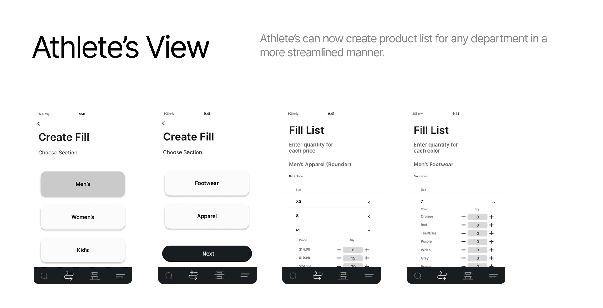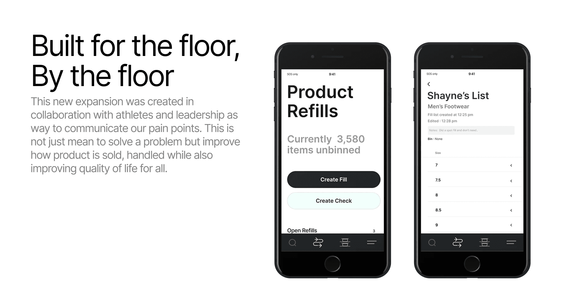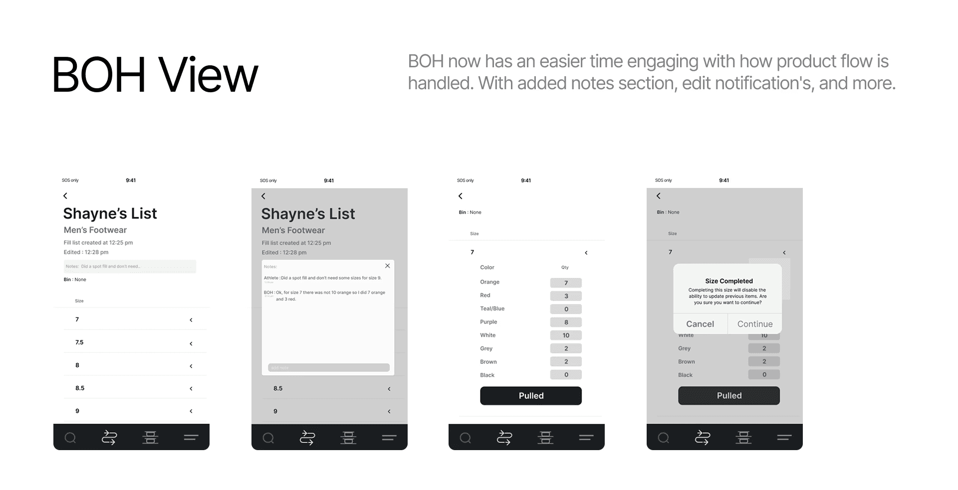 BOH and athletes now have views built around how they actually work. BOH gets edit notifications, threaded notes, and confirmation prompts when sizes are completed. Athletes can create product lists for any department organized exactly how they think on the floor. Apparel by price point. Footwear by size and color.