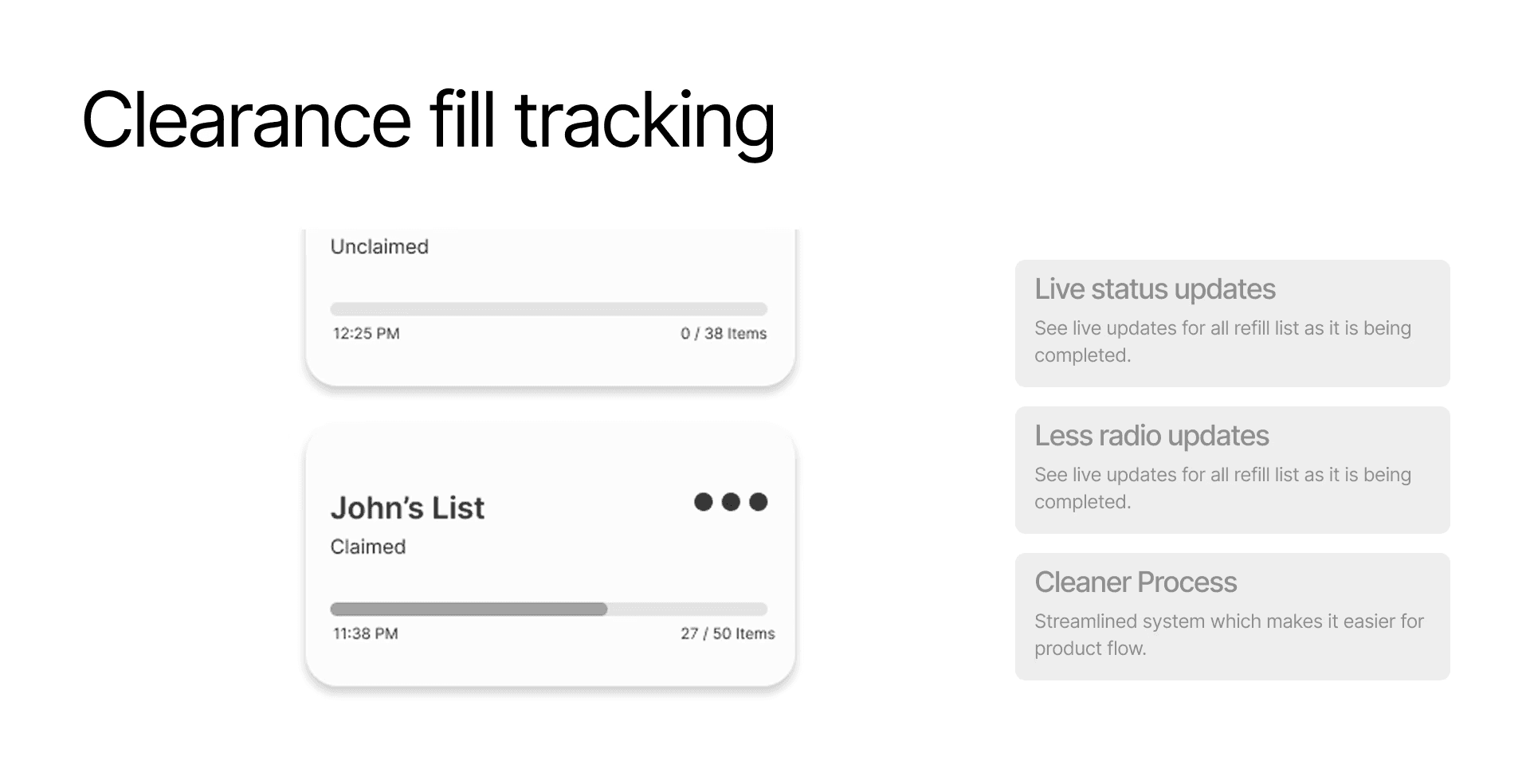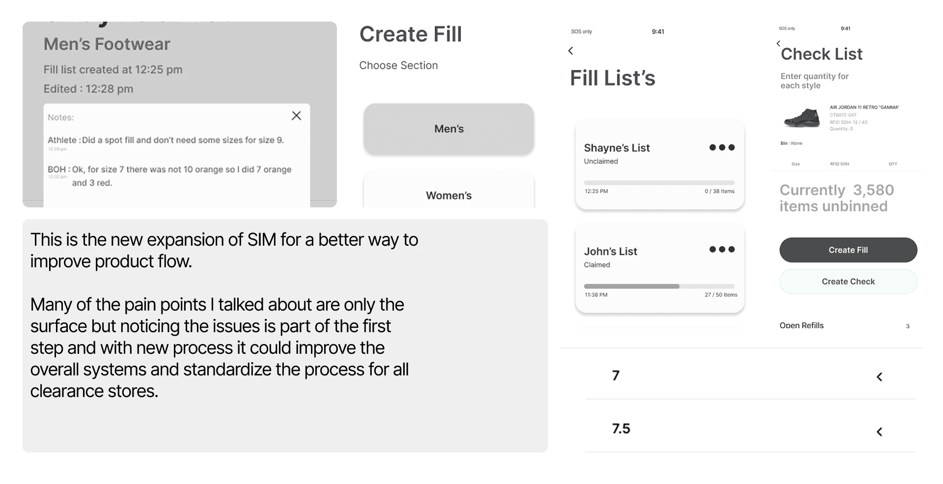 The answer was one module inside SIM built specifically for clearance. A refills dashboard that shows live fill progress as items are pulled. A creation flow that starts with department and section instead of bin status because that's how clearance teams actually think and a connected system that ties fill tracking, item checks, and BOH communication into one place for the first time.
