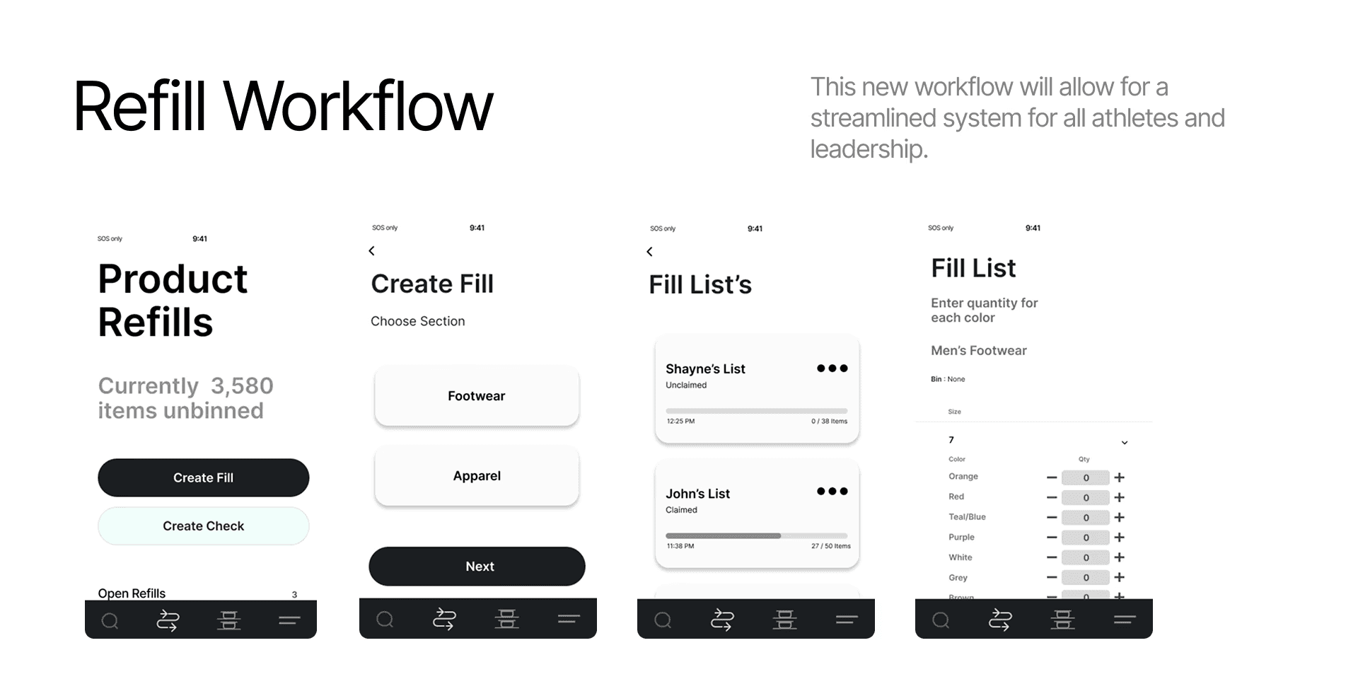 Fill list shows live claim status, a progress bar, item counts, and edit options so everyone knows what's being handled without asking anyone. Item entry is organized by department with expandable size rows and quick quantity controls. A notes section on every list keeps athletes and BOH connected directly in the system with timestamps on every change.