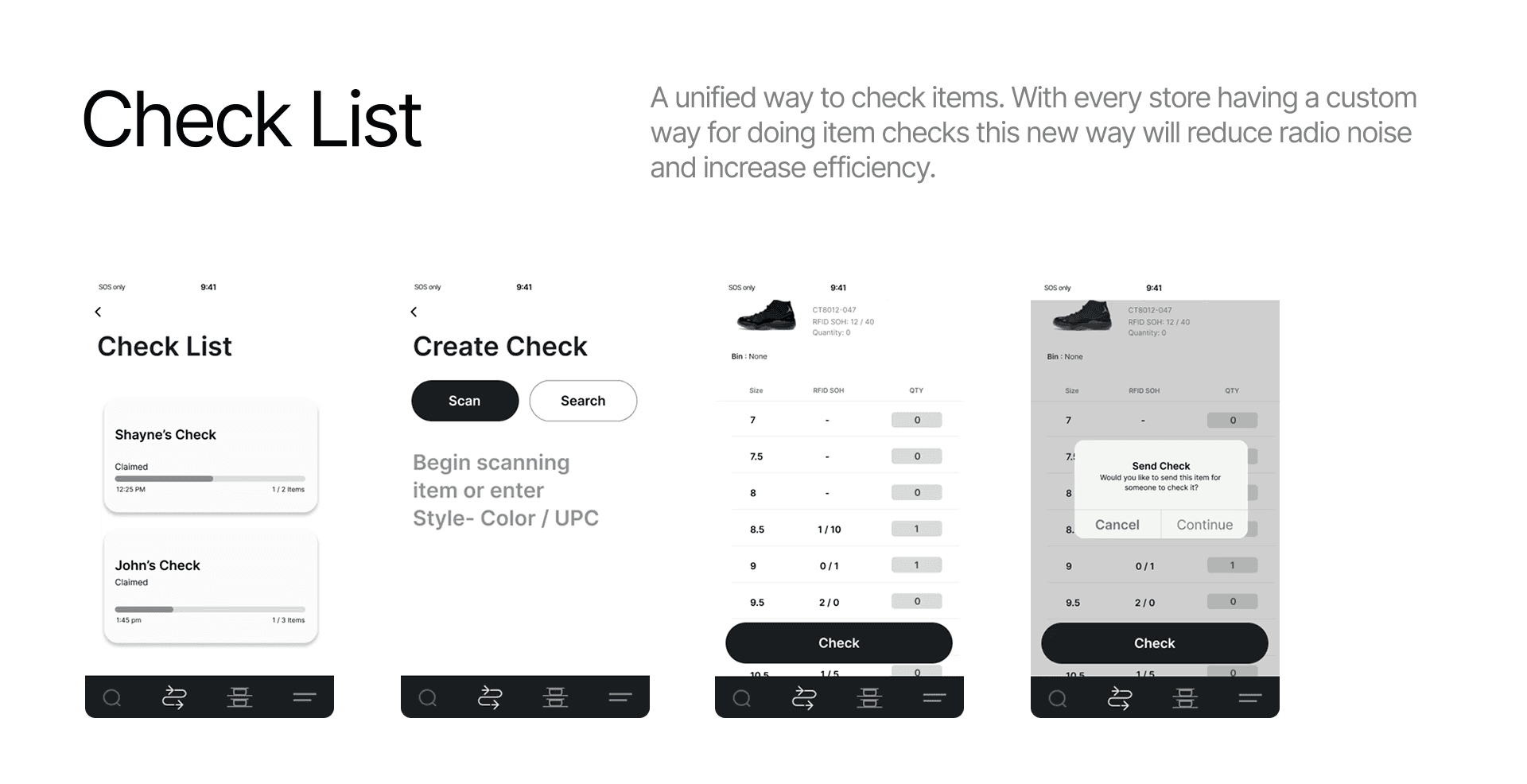 Item checks got a complete overhaul. Scan or search an item, see RFID inventory by size, fill your quantities, and send a check directly through the app. No radio calls, no waiting.